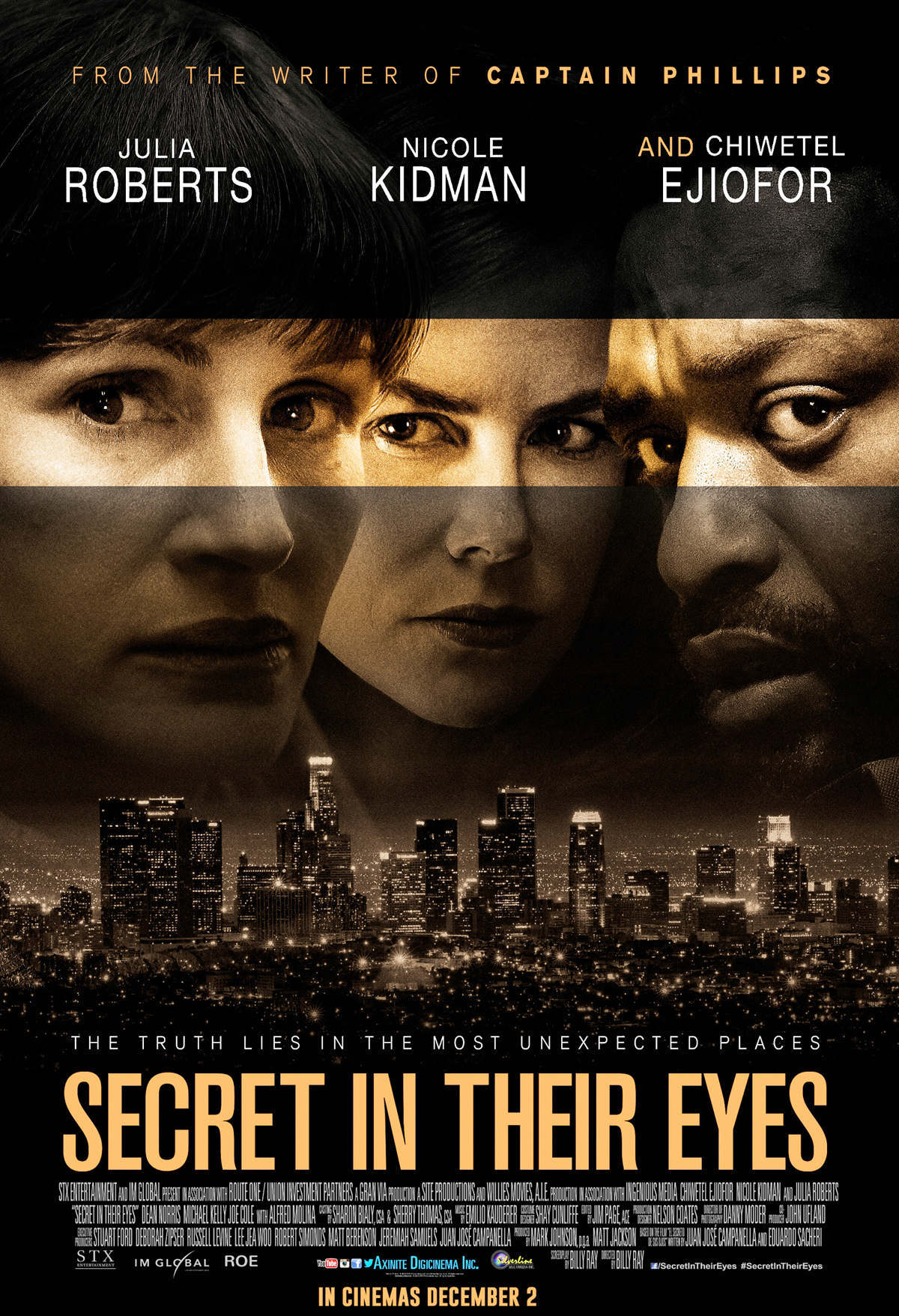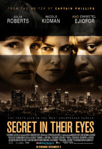 Secret in their eyes (Aux yeux de tous), c’est une histoire captivante et triste qui ne vous laissera pas indifférents. J’y note aussi le talent de ceux qui donné vie personnages principaux : Chiwetel Ejiofor (Ray) qui apparait aussi dans The Martian avec Matt Damon; Julia Roberts (Jess) ; Nicole Kidman (Claire, Représentante du bureau du procureur); Dean Morris (Bumpy, ami et collègue de Ray) qui apparait dans les 4 fantastiques (la première sortie) dans le rôle de la chose.